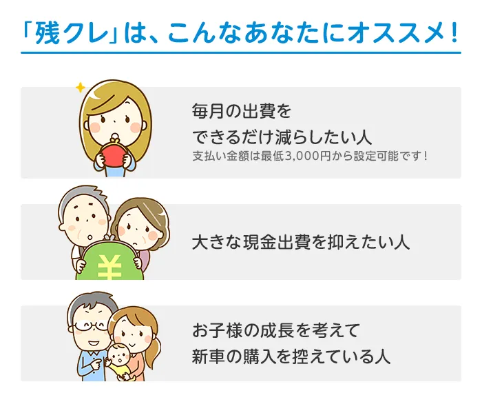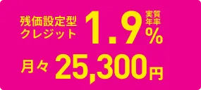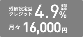 (残価設定型クレジットのお支払い例について)・上記お支払い例は2026年1月の一例です。・上記お支払い例は、初回お支払い月を2026年3月、初回ボーナス月を2026年7月(以下ボーナス月は12月・7月)で計算した一例です。※本クレジットは最終回に、@新車に乗り換えA乗り続ける(最終回お支払い額を一括または再クレジットでお支払い)B車両を返却 のいずれかをお選びいただけます。@、Bの場合、内外装キズや走行距離などの確認事項があります。事前に定めた条件を超える場合には、その差額分を別途ご負担いただきます。詳しくは下記をご覧ください。