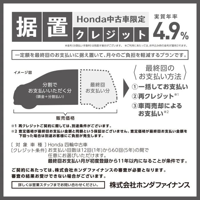 【据置クレジットのお支払い例について】●2026年3月の一例です。●初回お支払い月を2026年4月、初回ボーナス月を2026年6月(以下ボーナス月を12月・6月)で計算した一例です。最終回のお支払い方法は@一括してお支払い、A再クレジット※1、B車両売却によるお支払い※2 のいずれかをお選びいただけます。●「据置クレジット」について詳しくは下記をご覧ください。