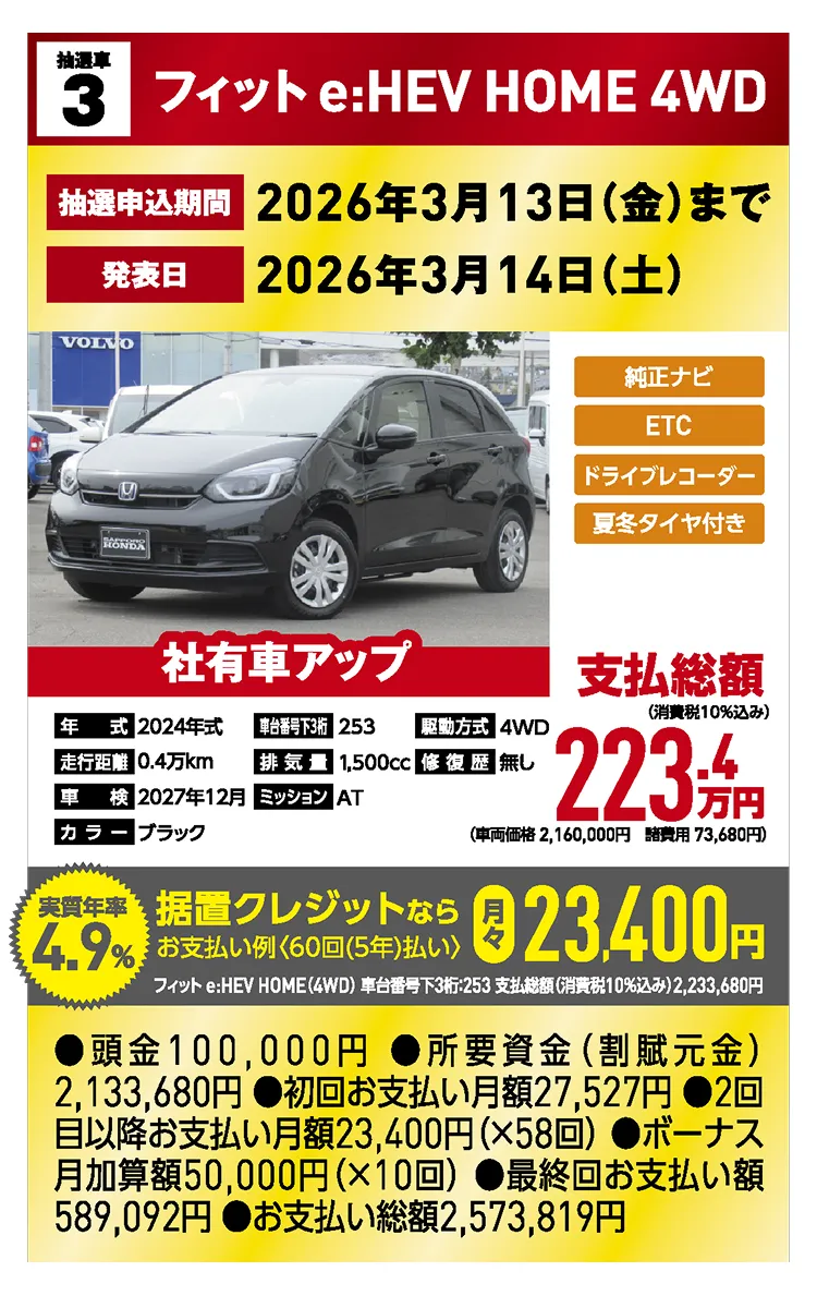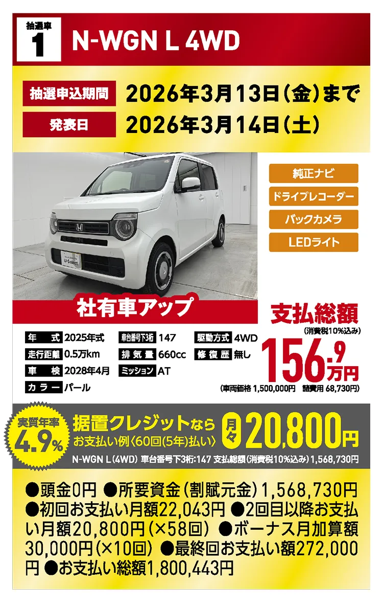 *支払総額は、1月現在、道内登録(届出)で店頭納車の場合の価格です。お客様の要望に基づくオプション等の費用は別途申し受けます。支払総額には、税金及び自賠責保険料、自動車リサイクル料金、登録等に伴う費用等、購入の際に必要な全ての費用が含まれています。※支払総額のうち、自賠責保険の費用は頭金に含めて計算しております。