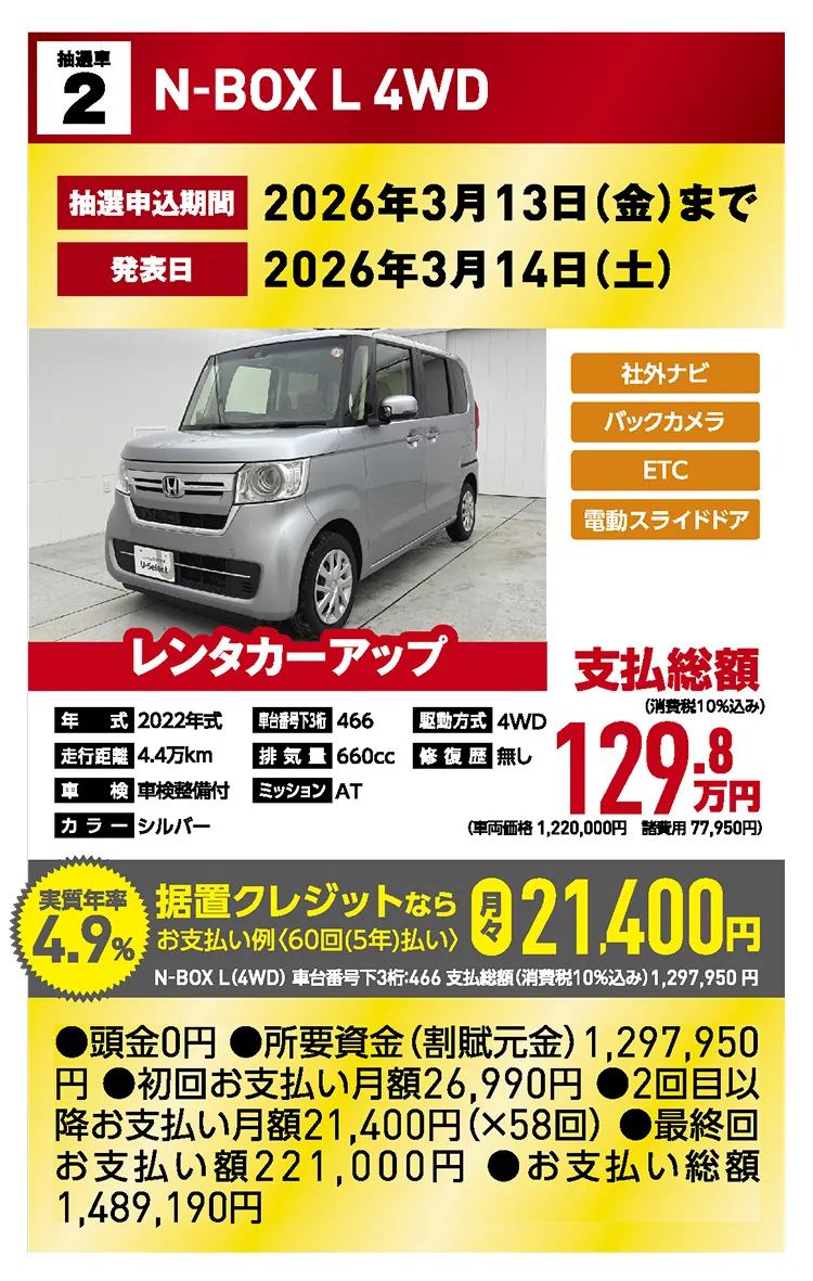 ■支払総額には、保険料、税金(いずれも未経過相当含む)、リサイクル料金相当額、整備費用、登録等に伴う費用等すべての費用が含まれています。■諸費用は、2026年3月現在、札幌ナンバー管轄登録(届出)で店頭納車の場合の費用です。お客様の要望に基づく整備やオプション等の費用は別途申し受けます。■価格はすべて消費税10%込みの価格です。■現車は店頭にて十分ご確認の上、ご検討ください。上記掲載内容についてご不明な点はスタッフにお尋ねください。■車検整備付・・・車検証の有効期限が切れています。24ヶ月点検を実施(定期点検整備費用は支払総額に含まれます)し、車検を取得して納車します。■ETC車載器を使用するには、別途決済用のETCカード、セットアップ作業(セットアップ費用)が必要となります。■掲載内容に明らかな不備があった場合、やむなく販売をお断りすることがあります。あらかじめご了承ください。■詳しくは営業スタッフまでお問い合わせください。