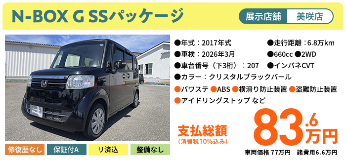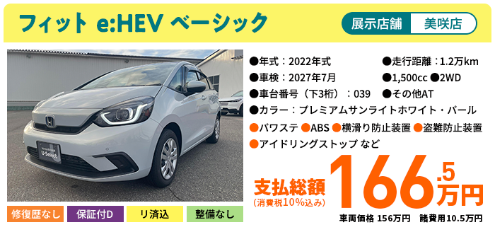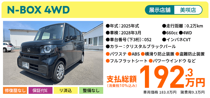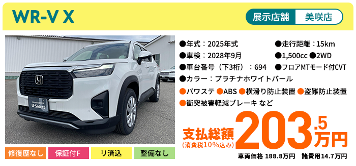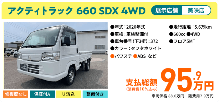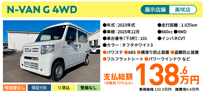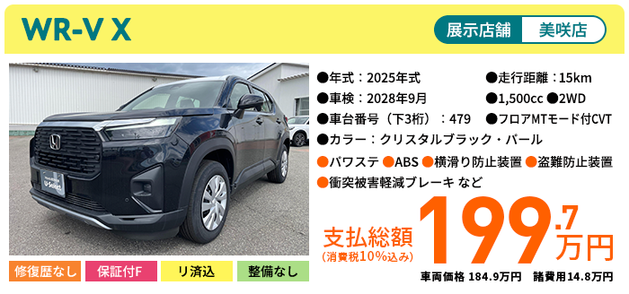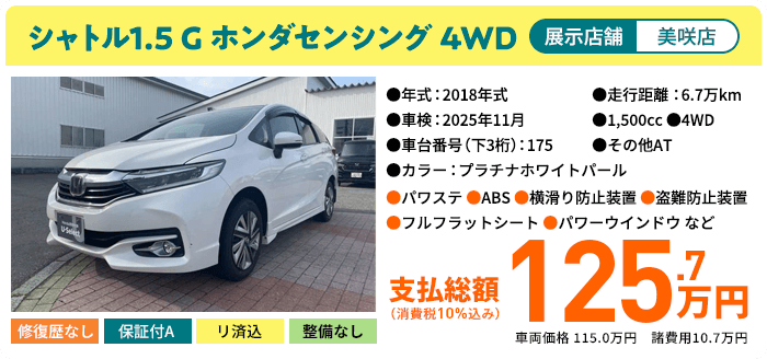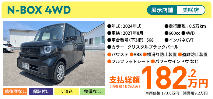 ※価格はすべて消費税10%込みの価格です。※現車は店頭にて十分ご確認の上、ご検討ください。上記掲載内容についてご不明な点はスタッフにお尋ねください。※掲載内容に明らかな不備があった場合、やむなく販売をお断りすることがあります。あらかじめご了承ください。※支払総額は、6月現在、販売店の管轄の運輸支局等で登録(届出)で店頭納車の場合の価格です。お客様の要望に基づくオプション等の費用は別途申し受けます。支払総額には、税金及び自賠責保険料、自動車リサイクル料金、登録等に伴う費用等、購入の際に必要な全ての費用が含まれています。※車検整備付…車検証の有効期限が切れています。24ヶ月点検を実施し(定期点検整備費用は支払総額に含まれます)、車検を取得して納車します。※詳しくは営業スタッフまでお問い合わせください。