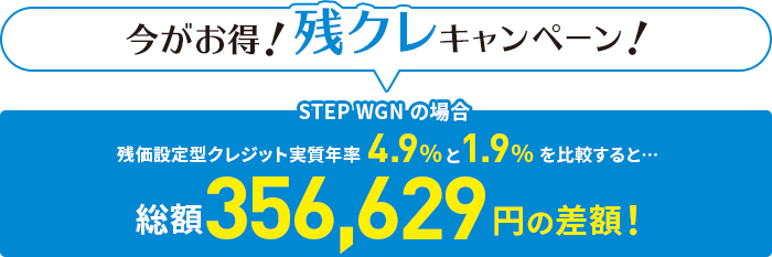 【残価設定型クレジットのお支払い例について(STEP WGN)】・上記お支払い例は2025年11月の一例です。・上記お支払い例は、初回お支払い月を2026年1月で計算した一例です。※本クレジットは最終回に、@新車に乗り換えA乗り続ける(最終回お支払い額を一括または再クレジットでお支払い)B車両を返却 のいずれかをお選びいただけます。@、Bの場合、内外装キズや走行距離などの確認事項があります。事前に定めた条件を超える場合には、その差額分を別途ご負担いただきます。詳しくは営業スタッフまでお問い合わせください。